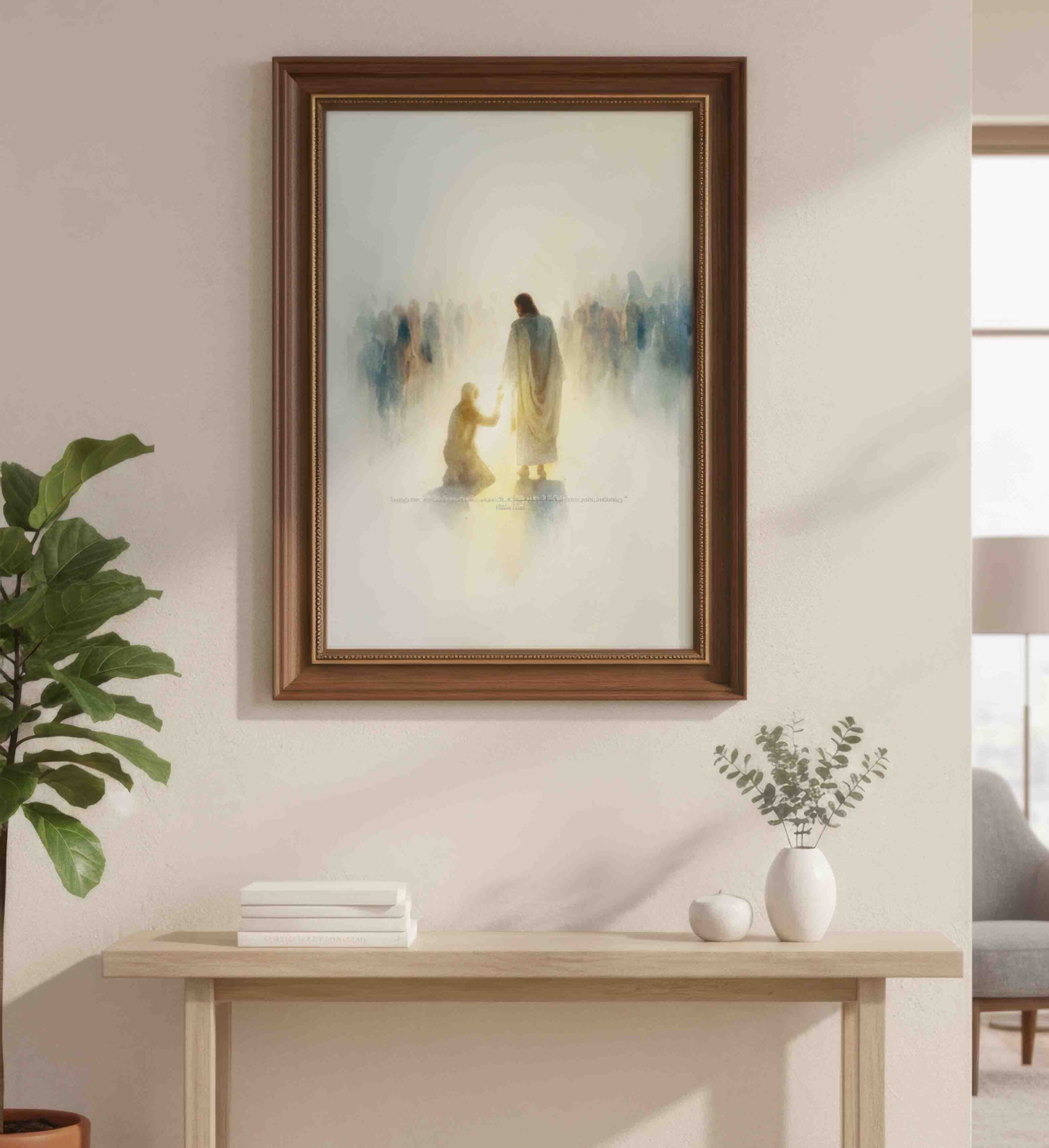 Capture the powerful moment of faith and restoration with this Jesus Heals the Bleeding Woman Premium Paper Print from Magic Tree Prints. This artwork depicts the woman healed by her faith just by touching Jesus’ garment (Luke 8:43-48), a beautiful reminder of hope and Christ’s compassionate words: ‘Daughter, your faith has healed you. Go in Peace and be freed from your suffering.’ This minimalist Christian art piece uses a soft palette to radiate peace and healing, making it an excellent addition to modern faith decor in any home, office, or prayer space. Our high-quality print is produced on premium paper and is perfect as an inspiring religious gift that symbolizes restoration and divine love.