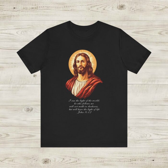 Our extra soft unisex jersey short sleeve teeย that fits like a well-loved favorite. This artwork represents Jesus, the light of God and that those who follow him will not be in despair but walk in the light.