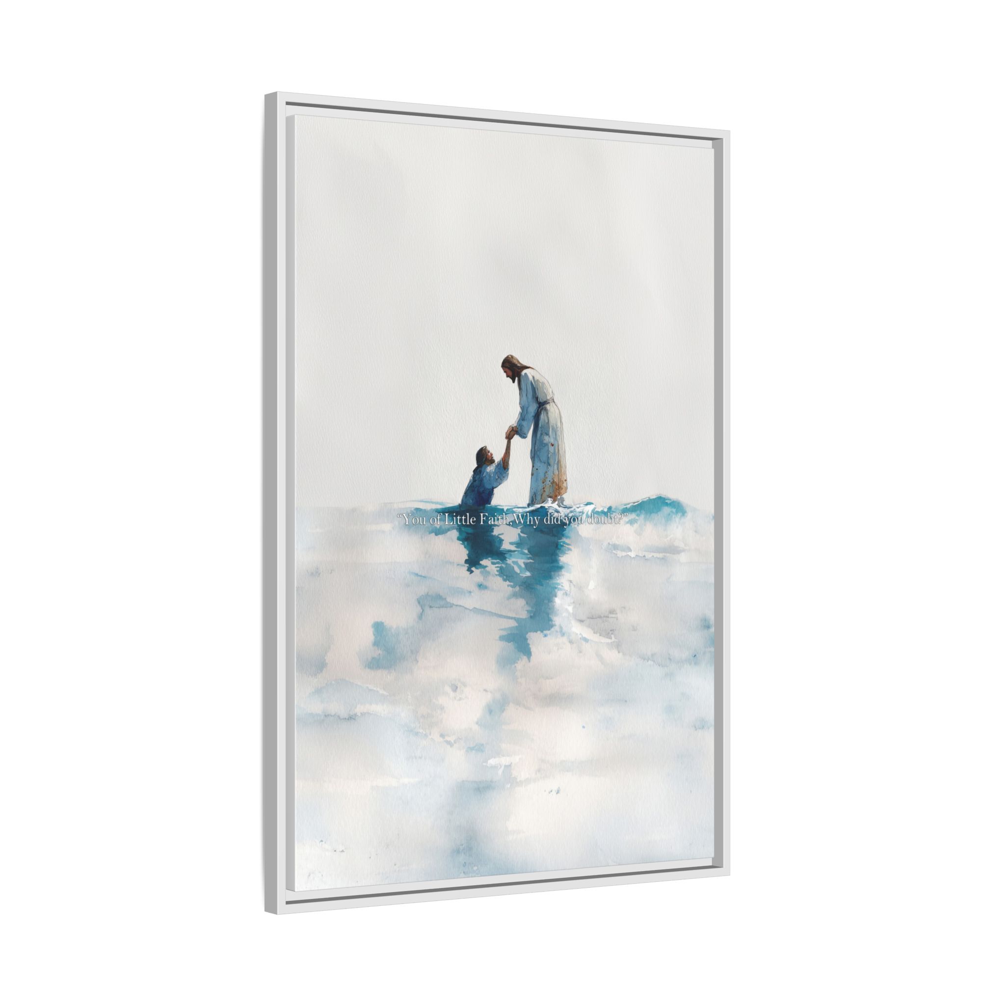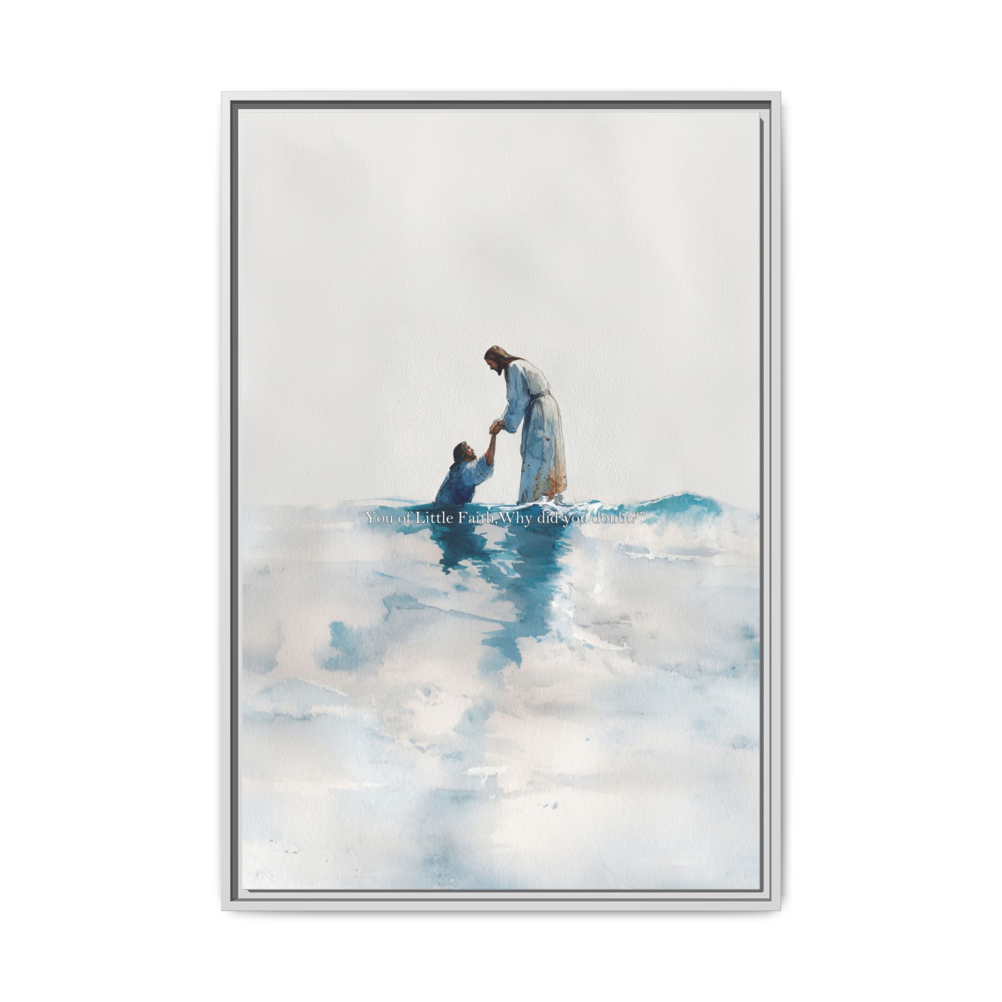 Inspired by Jesus’ words to Peter as he began to sink while walking on water, this artwork captures the tender yet powerful moment where faith meets fear. “Why did you doubt?” reminds us that even in the storm, Christ is near — reaching out with love, not condemnation.