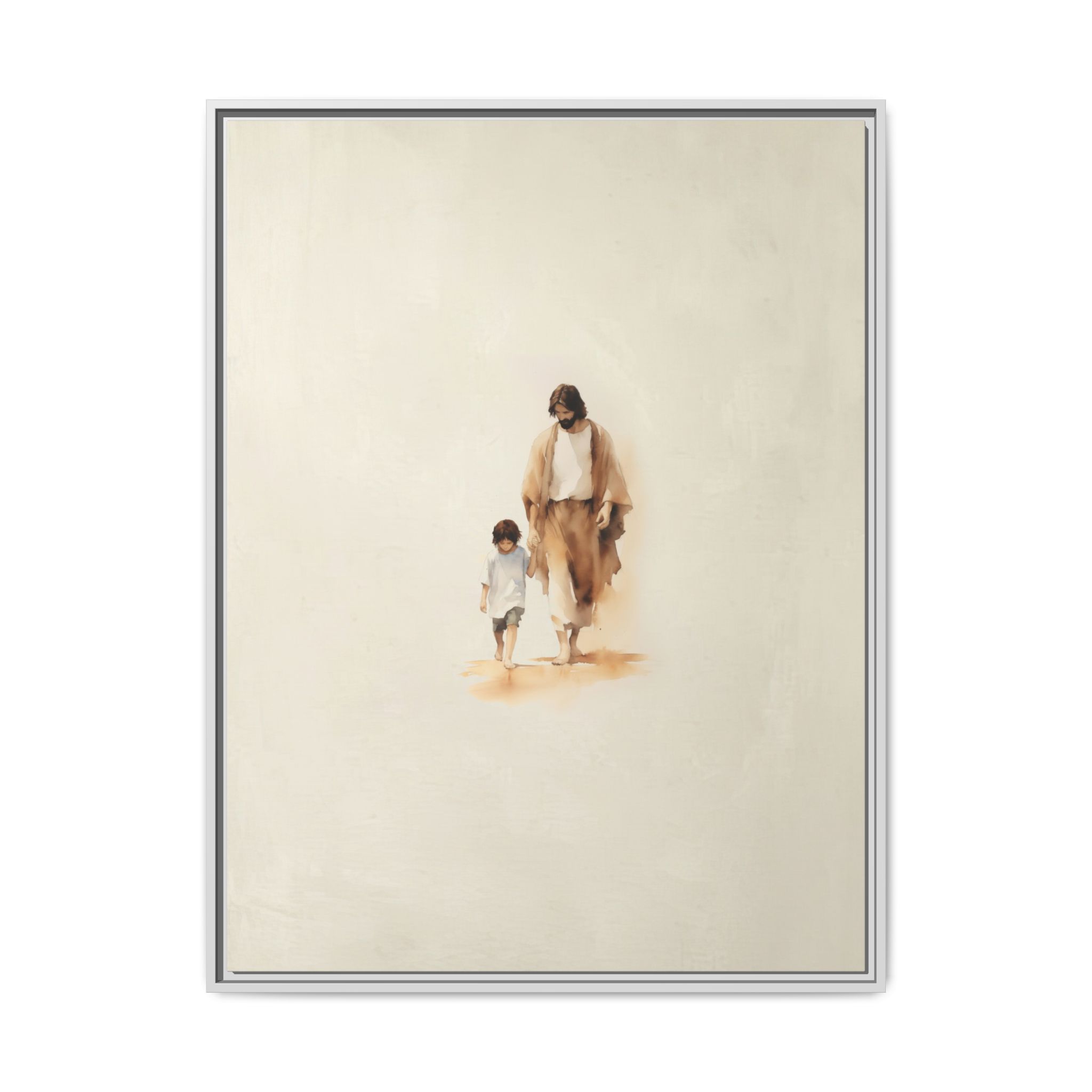Capture the feeling of peace and safety with this tender Jesus with Boy Christian Framed Canvas Print from Magic Tree Prints. This uniquely designed watercolor illustration shows Jesus walking hand-in-hand with a young boy, a beautiful symbol of His deep, personal love and protection for every child. It serves as a comforting, powerful reminder of Christ’s presence and guidance throughout a young life. Highly popular for children’s rooms and as a meaningful memorial piece, this print is crafted on premium, museum-grade archival paper for vibrant detail and superior quality. It makes an ideal Baptism, First Communion, or Birthday Gift for any boy