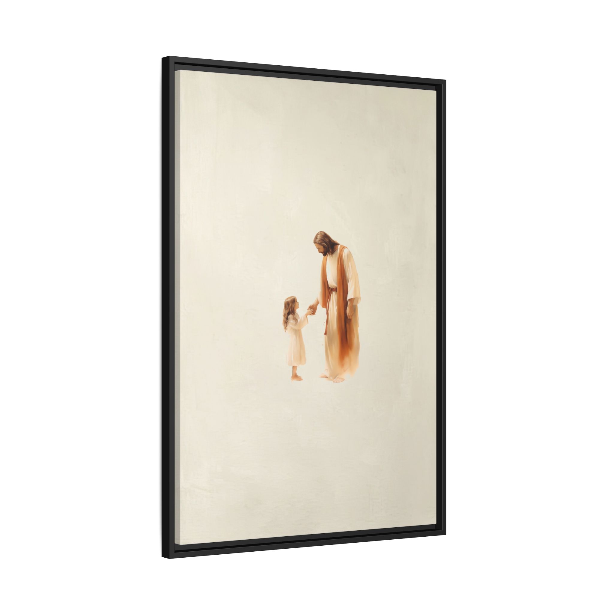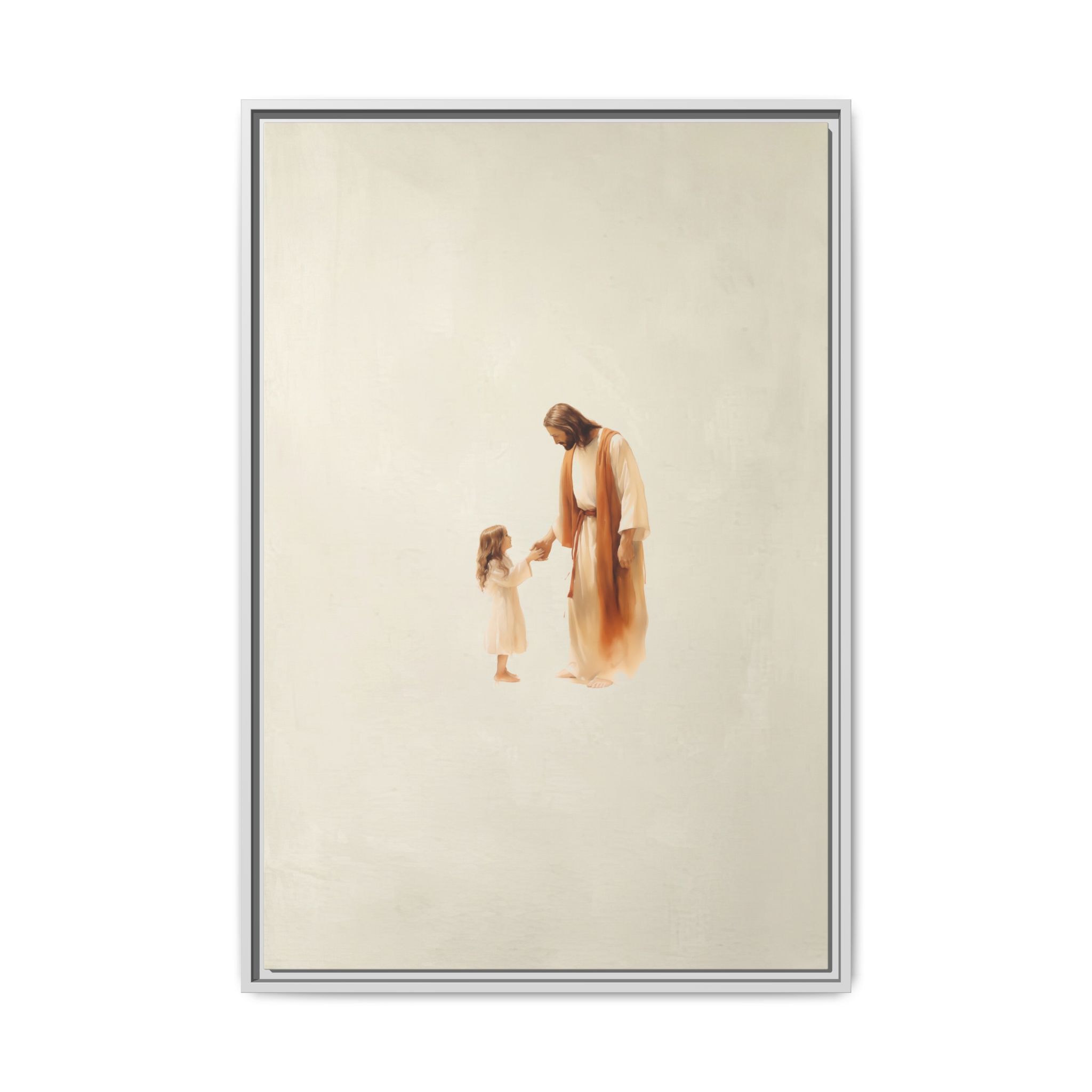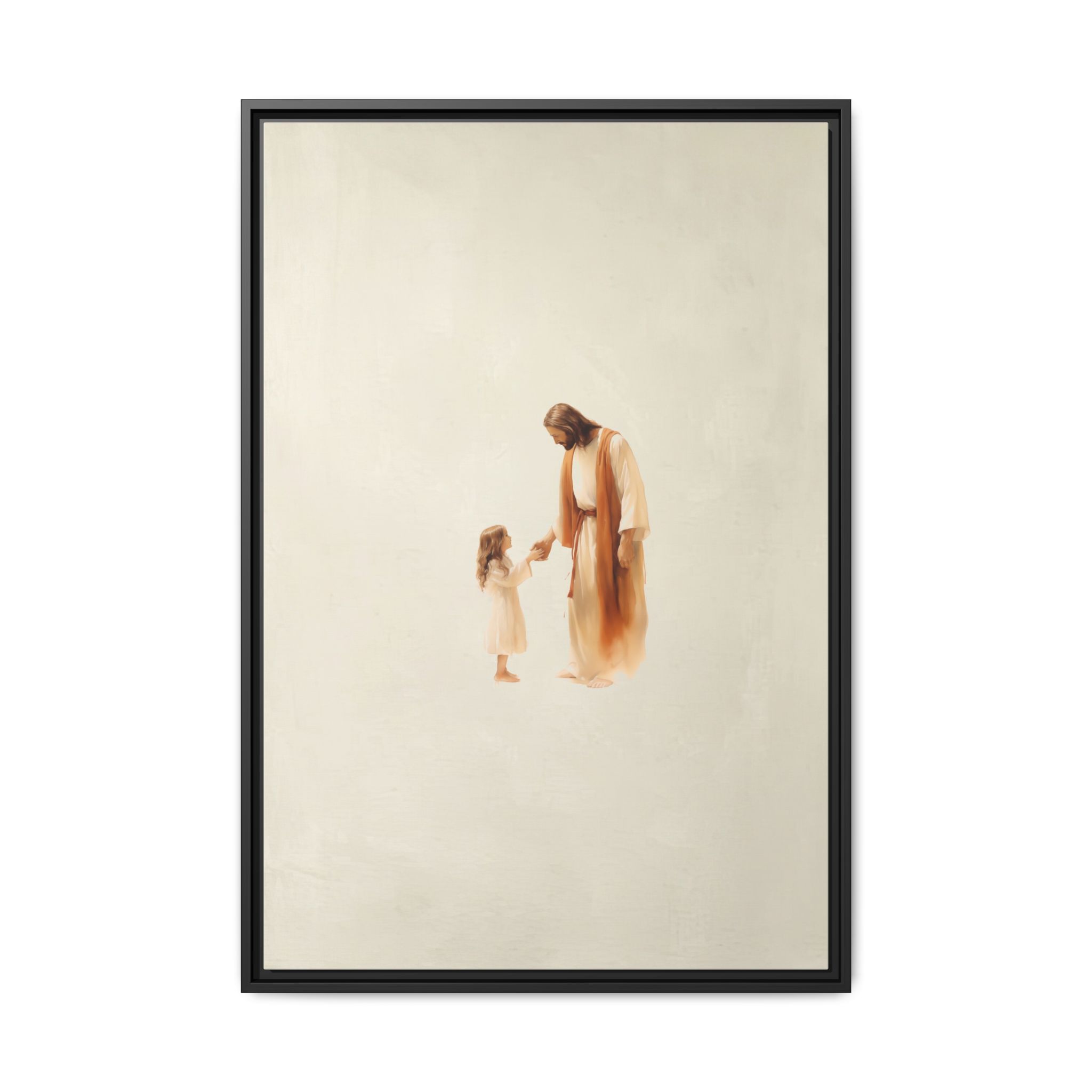 Capture the feeling of absolute love and security with this Jesus with Girl Framed Canvas Print from Magic Tree Prints. This uniquely designed watercolor illustration shows Jesus comforting a little girl, symbolizing His boundless love and protection for all of us. This piece reminds viewers to approach God with simple reliance and offers a powerful visual of unconditional love. It’s the perfect, heart-melting addition to a Christian nursery, child’s bedroom, or family living space. Our high-quality print is produced on premium canvas for beautiful detail and lasting color, making it an ideal Baptism or Godchild Gift
