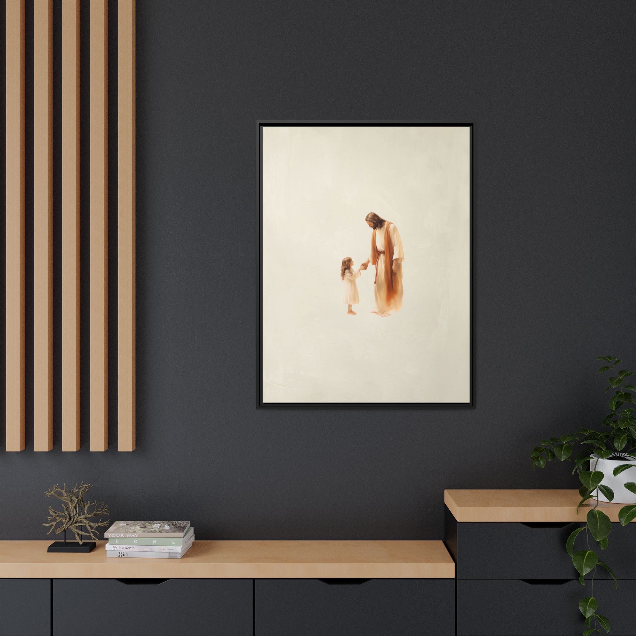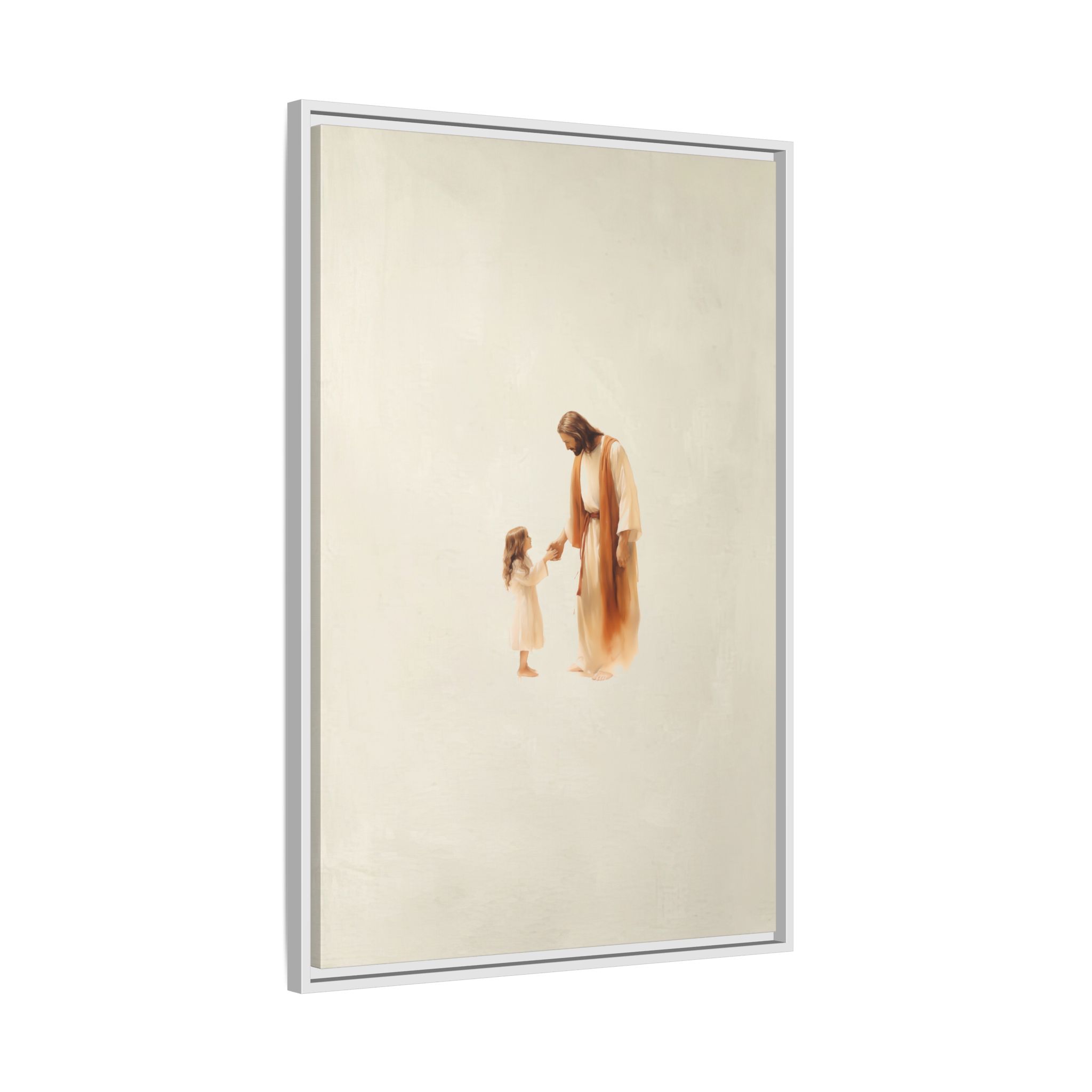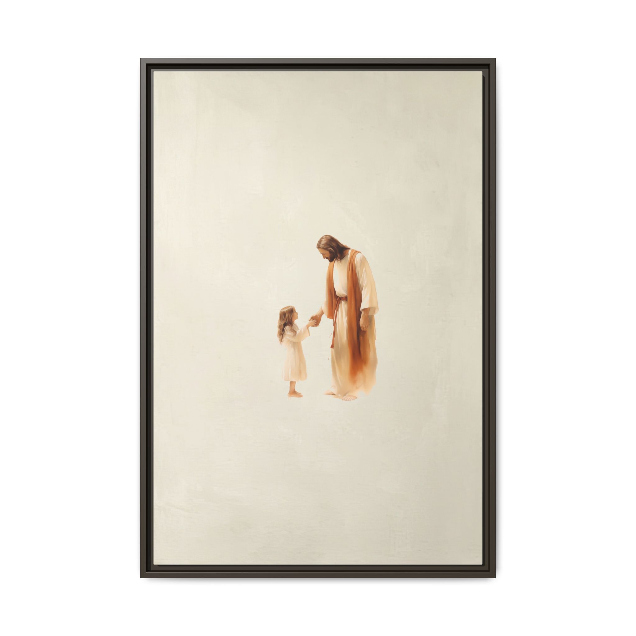 Capture the feeling of absolute love and security with this Jesus with Girl Framed Canvas Print from Magic Tree Prints. This uniquely designed watercolor illustration shows Jesus comforting a little girl, symbolizing His boundless love and protection for all of us. This piece reminds viewers to approach God with simple reliance and offers a powerful visual of unconditional love. It’s the perfect, heart-melting addition to a Christian nursery, child’s bedroom, or family living space. Our high-quality print is produced on premium canvas for beautiful detail and lasting color, making it an ideal Baptism or Godchild Gift