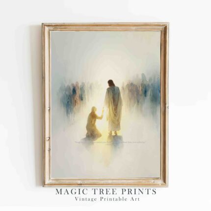 IThis art captures the powerful moment a woman, after 12 years of suffering, is healed by her faith just by touching Jesus's garment. It is a beautiful reminder of hope, restoration, and Christ's compassionate words: "Daughter, your faith has healed you. Go in Peace and be freed from your suffering" - Mark 5:34